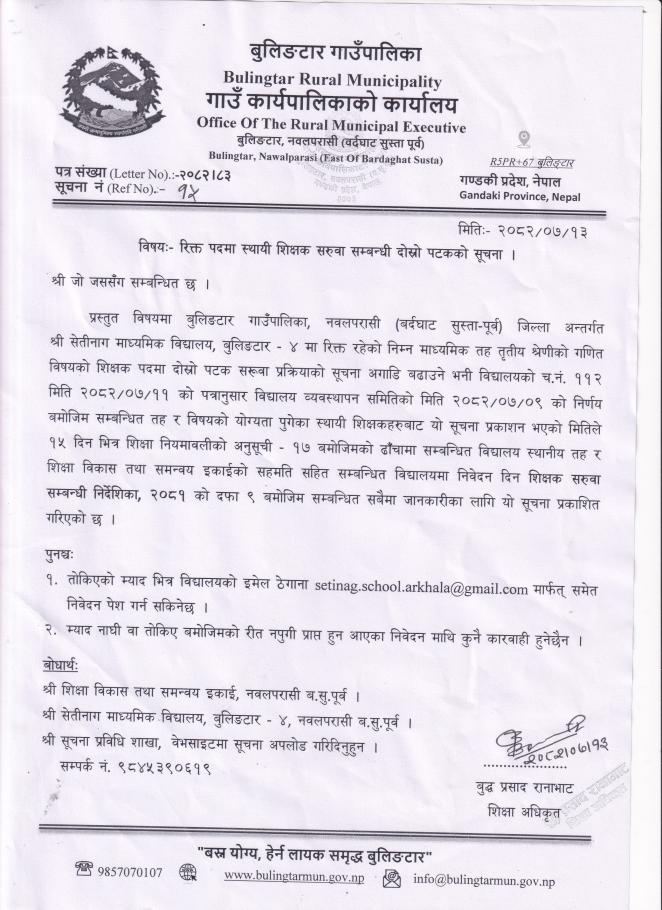 रिक्त पदमा स्थायी शिक्षक सुरुवा सम्बन्धी दोस्रो पटकको सुचना ।