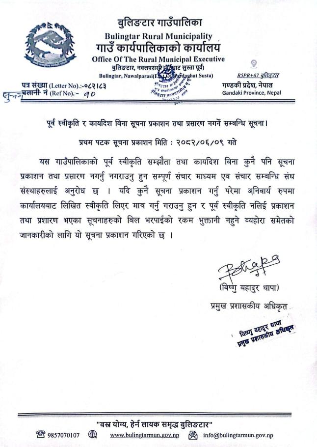 पुर्व स्वीकृति कार्यादेश बिना सुचना प्रकाशन नगर्ने सम्बन्धि सुचना ।