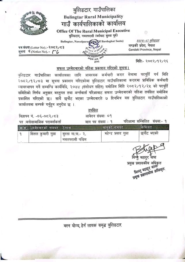 सफल उम्मेदवारको नतिजा प्रकाशन गरिएको सूचना!!!
