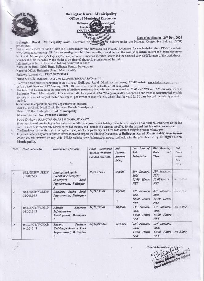 आ.व २०८२।०८३ को ढुंगा, गिट्टि र बालुवा उत्खनन् गरी बिक्री गर्ने कार्यको बोलपत्र आह्वान सम्बन्धी सुचना !!!